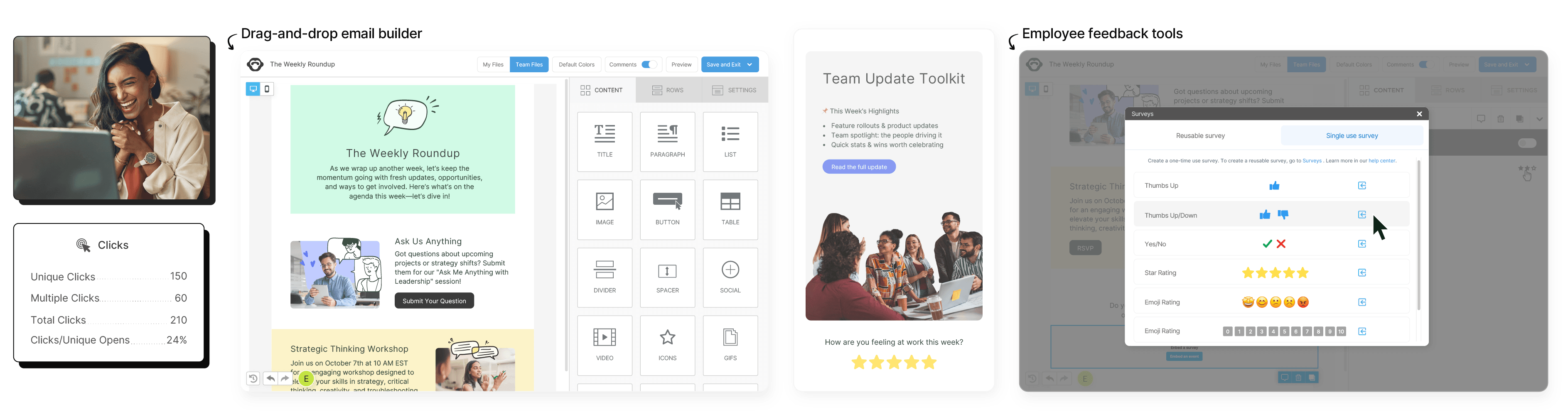 Engage employees with drag-and drop internal emails and gain visibility into performance.