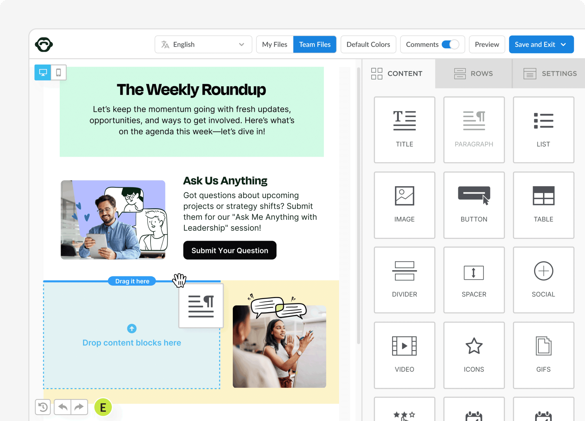 Get emails out when you need them—without waiting on IT or designers. Just drag and drop.