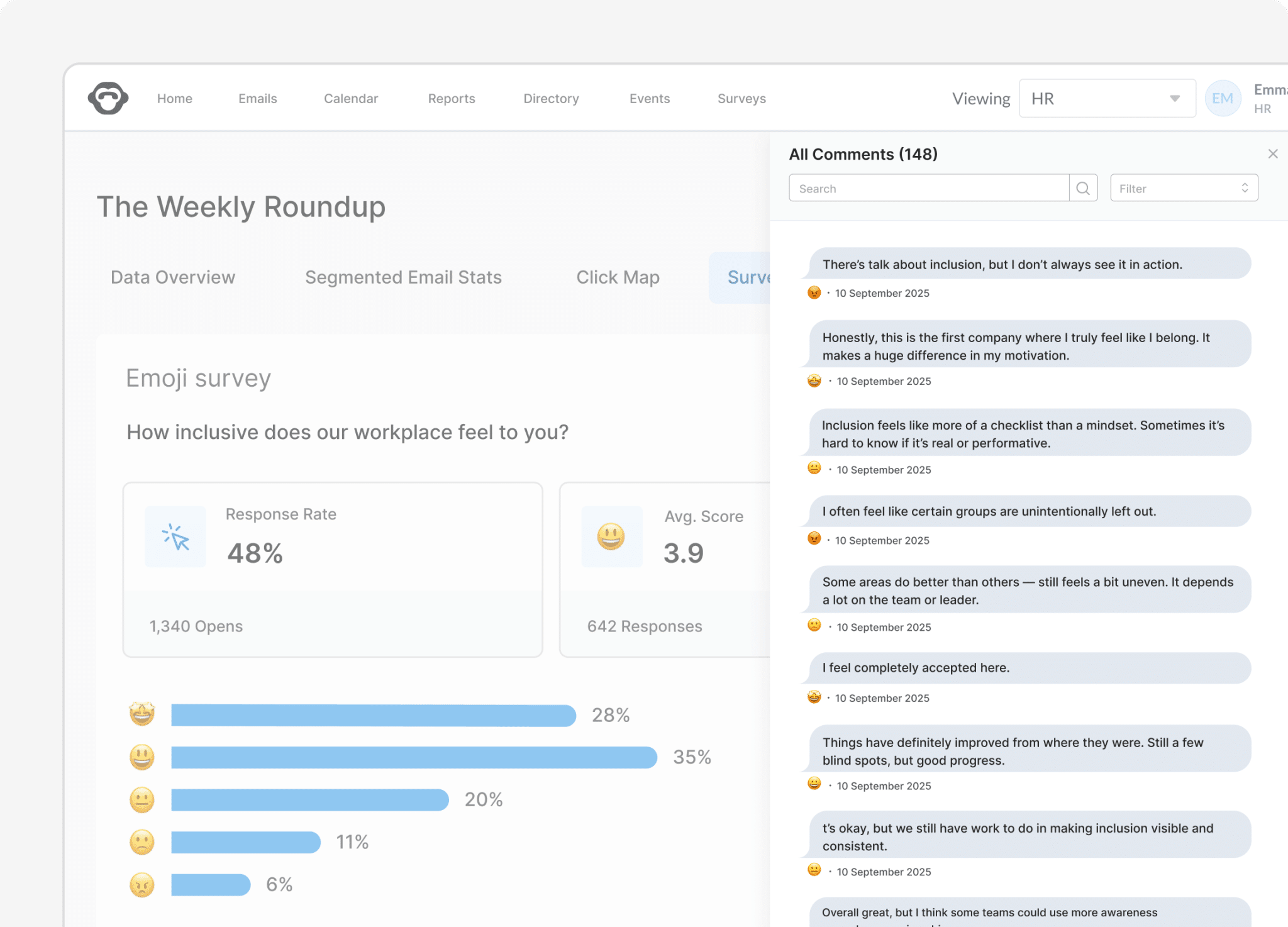 Use pulse surveys, emoji reactions, and feedback forms to capture employee sentiment.