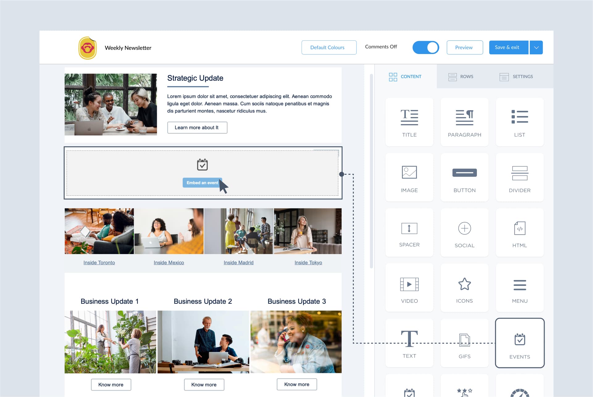Speaking of employee comments, let’s go back to the survey we inserted earlier. Employee email surveys created using ContactMonkey can be used to collect anonymous employee comments—all you need to do is click the Comments button at the top of the email template builder:
