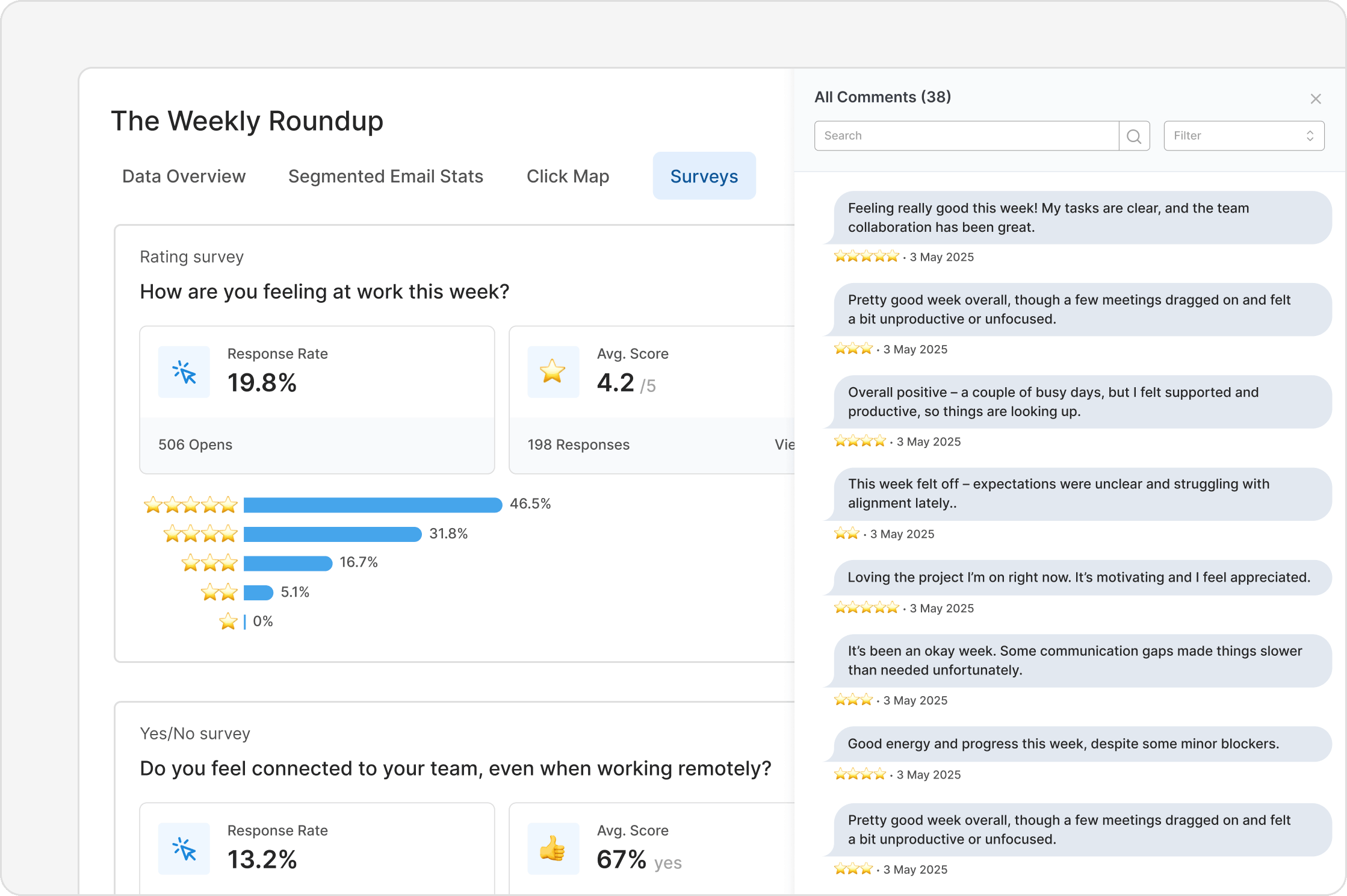 Embed pulse surveys, emoji reactions, and feedback forms directly inside your messages.