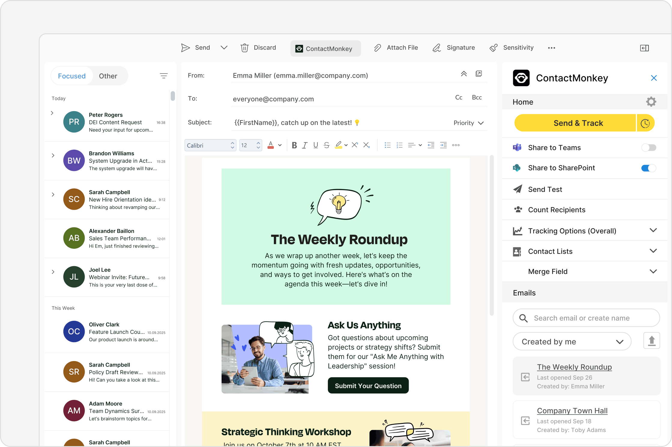 With ContactMonkey, you can create, send, and track internal emails right inside Outlook or Gmail, without ever leaving your inbox